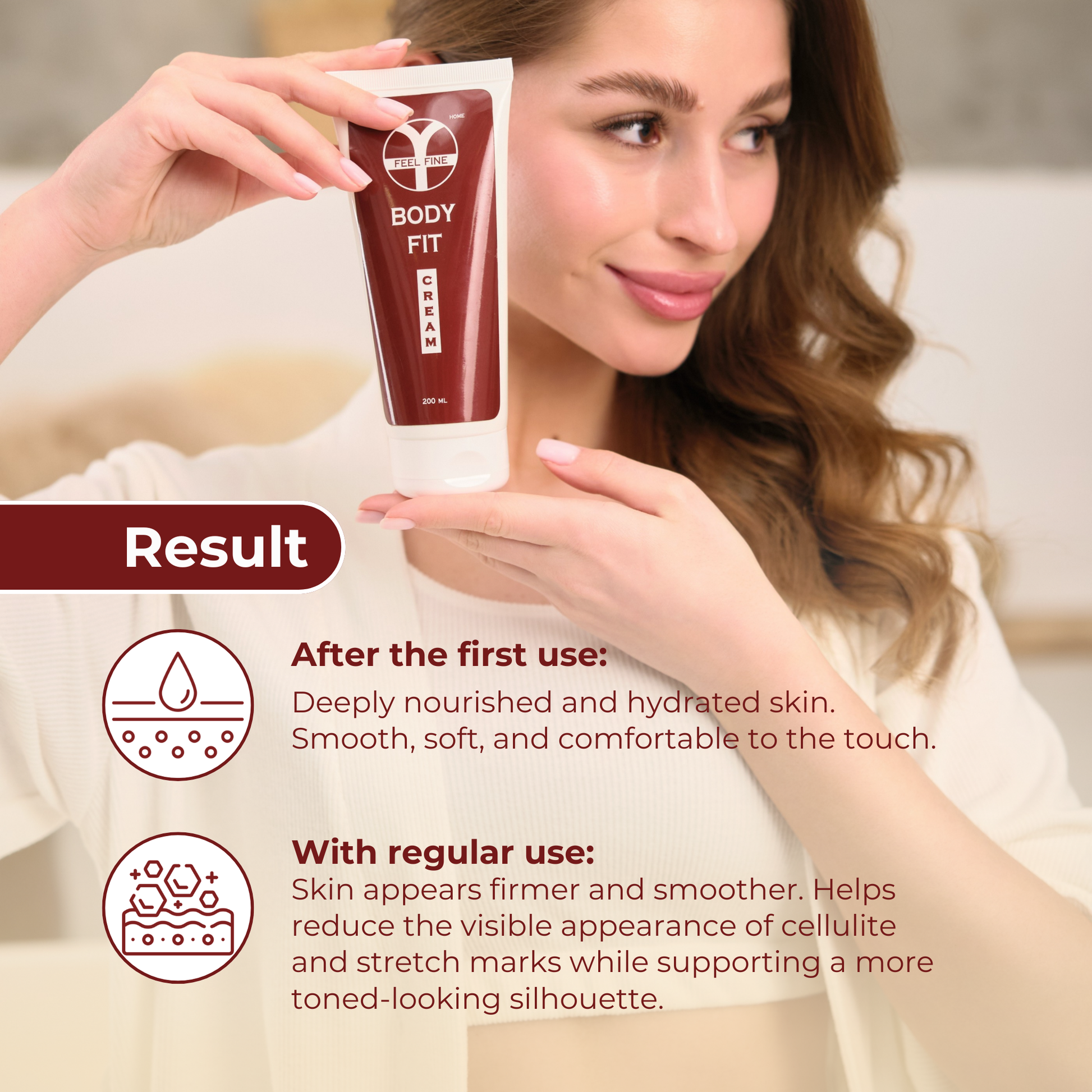 FEEL FINE Body Cream is designed to nourish the skin while supporting a smoother and more toned appearance. The formula contains a specialized lipolytic complex that works together with moisturizing ingredients to improve skin texture. The cream absorbs comfortably and leaves the skin soft and hydrated. The texture is suitable for daily body care and regular use after showering.