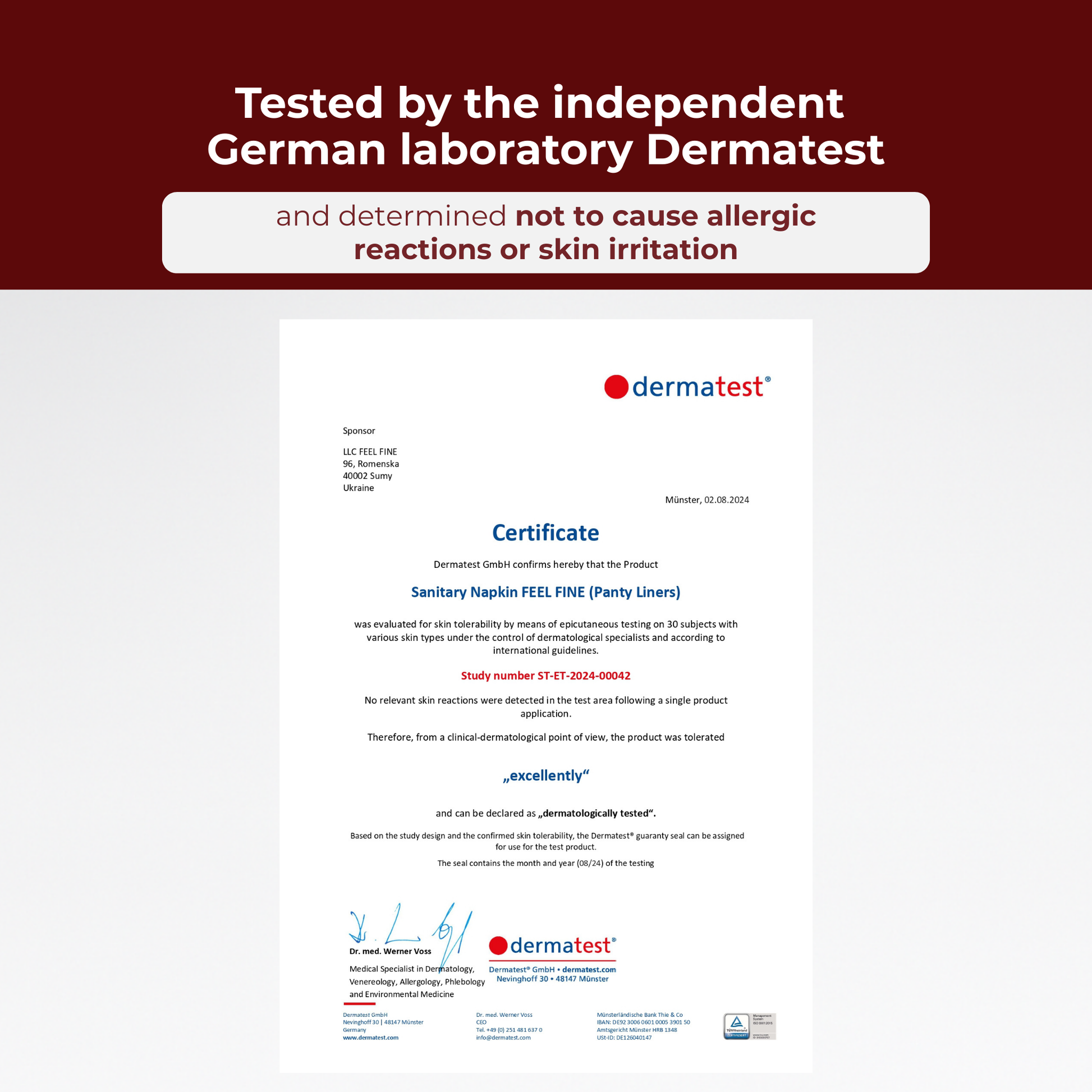 The liners are made from breathable nonwoven materials that support airflow. The central antibacterial strip helps reduce bacteria growth and unwanted odor. The formula contains no added fragrances. The product is dermatologically tested by Dermatest in Germany and confirmed to be non-allergenic.